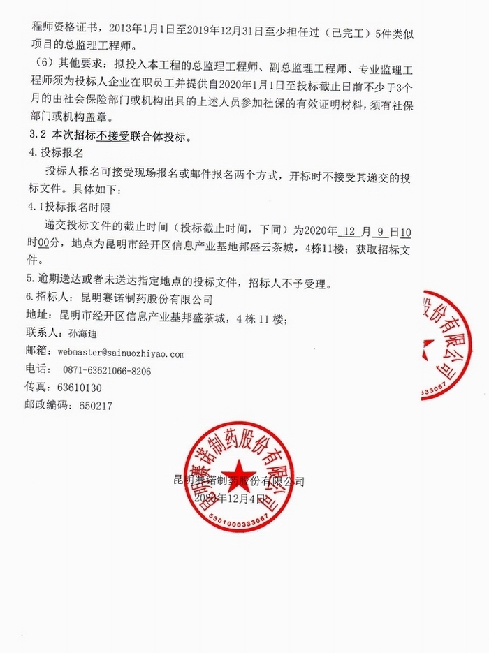 昆明賽諾制藥股份有限公司《中藥原料藥提取基地和綜合生產(chǎn)車(chē)間建設項目》建設工程監理招標公告